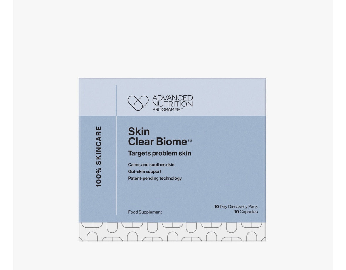 Featuring patent-pending biome technology, Skin Clear Biome™ is a next-generation skin supplement, formulated by Advanced Nutrition Programme™ experts to nurture the close connection between a healthy gut and balanced complexion.